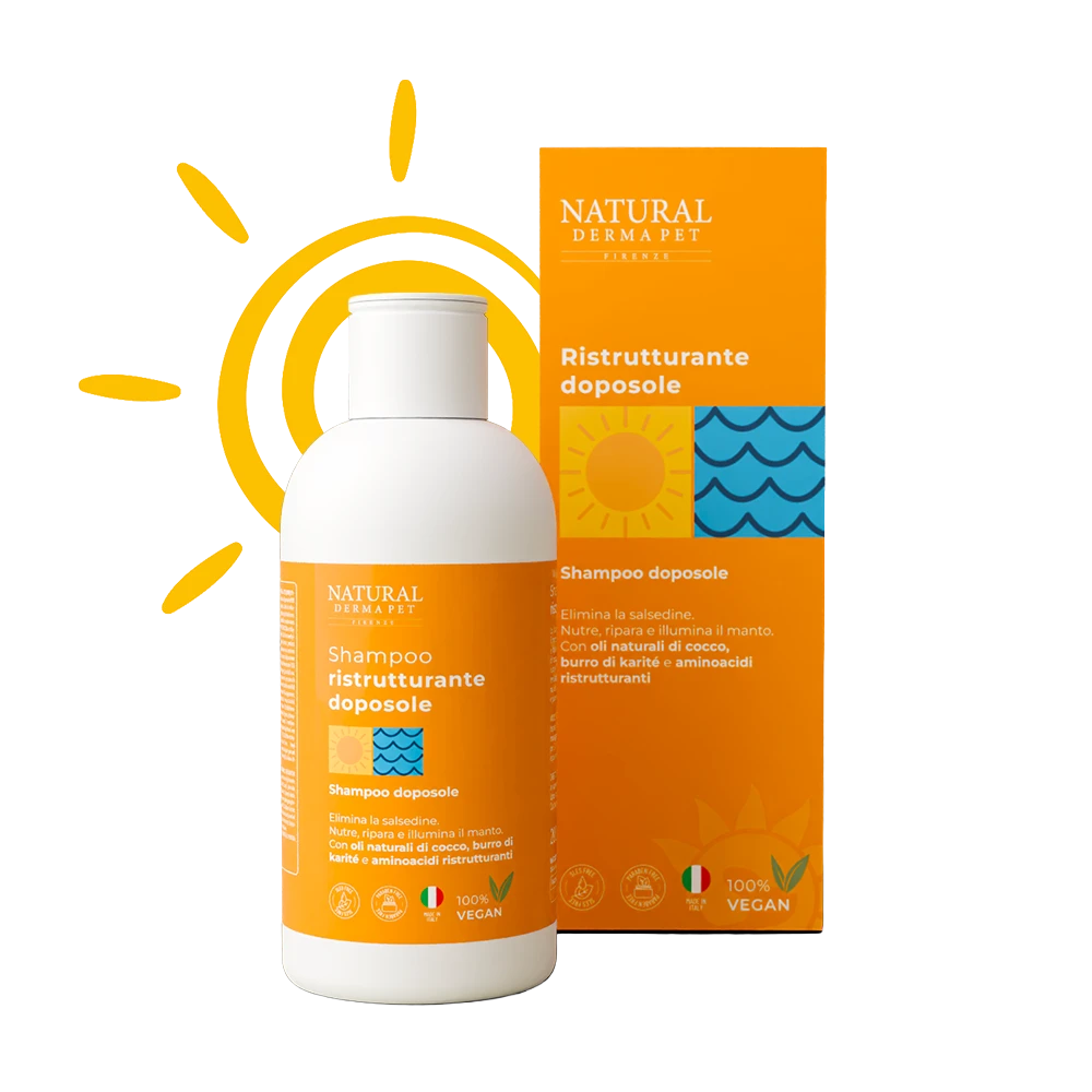 After-sun shampoo for dogs formulated for Gently cleanse the coat after sun exposure. Effectively removes salt, sand and impurities, respecting the sensitive skin. The hydrating and restructuring formula, enriched with Coconut oil, shea butter e restructuring amino acids, helps to nourish the fur, keeping the soft, protected and shiny coat. I plant-based surfactants guarantee a effective yet gentle cleaning, while the light fragrance leave the fresh and pleasantly scented coat.