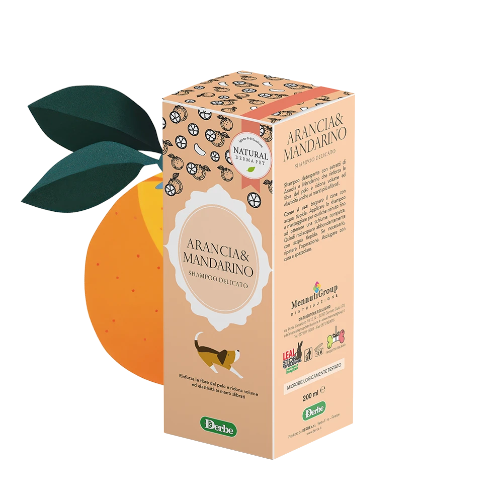 Shampoo Arancia e Mandarino per cani con estratti naturali, ideale per una detersione delicata e rinforzante. Aiuta a rinforzare le fibre del pelo e a ridonare volume ed elasticità anche ai manti più sfibrati, lasciando il pelo morbido, vitale e piacevolmente profumato.