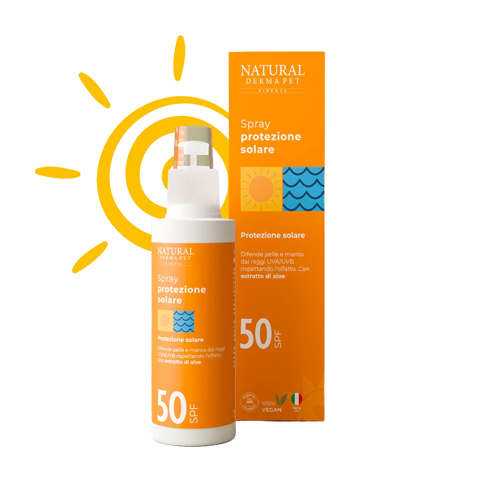 Spray solare protettivo SPF 50 per cani formulato per difendere la pelle sensibile dai raggi solari grazie a filtri ad ampio spettro UVA/UVB. Senza profumo, rispetta l’olfatto ed è adatto anche ai soggetti più delicati. La texture leggera e non appiccicosa si assorbe rapidamente, aiutando a prevenire arrossamenti e irritazioni nelle zone più esposte e a proteggere il manto dalle variazioni di colore dovute al sole. Arricchito con estratto di Aloe, svolge un’azione lenitiva e idratante, lasciando la pelle fresca e protetta durante le attività all’aria aperta.