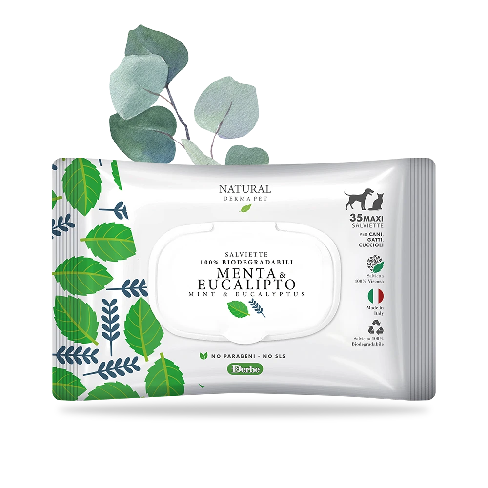 Salviette profumate Menta ed Eucalipto per cani e gatti, ideali per la pulizia quotidiana delicata. Realizzate in 100% viscosa biodegradabile di origine vegetale, detergono e rinfrescano il manto senza alcool, rispettando il pH e la cute sensibile. La profumazione fresca di menta ed eucalipto dona una sensazione di pulito intensa e rivitalizzante, migliorando la lucentezza del pelo. Pratiche e sicure, sono perfette a casa o dopo le passeggiate, per un’igiene quotidiana efficace e sostenibile.