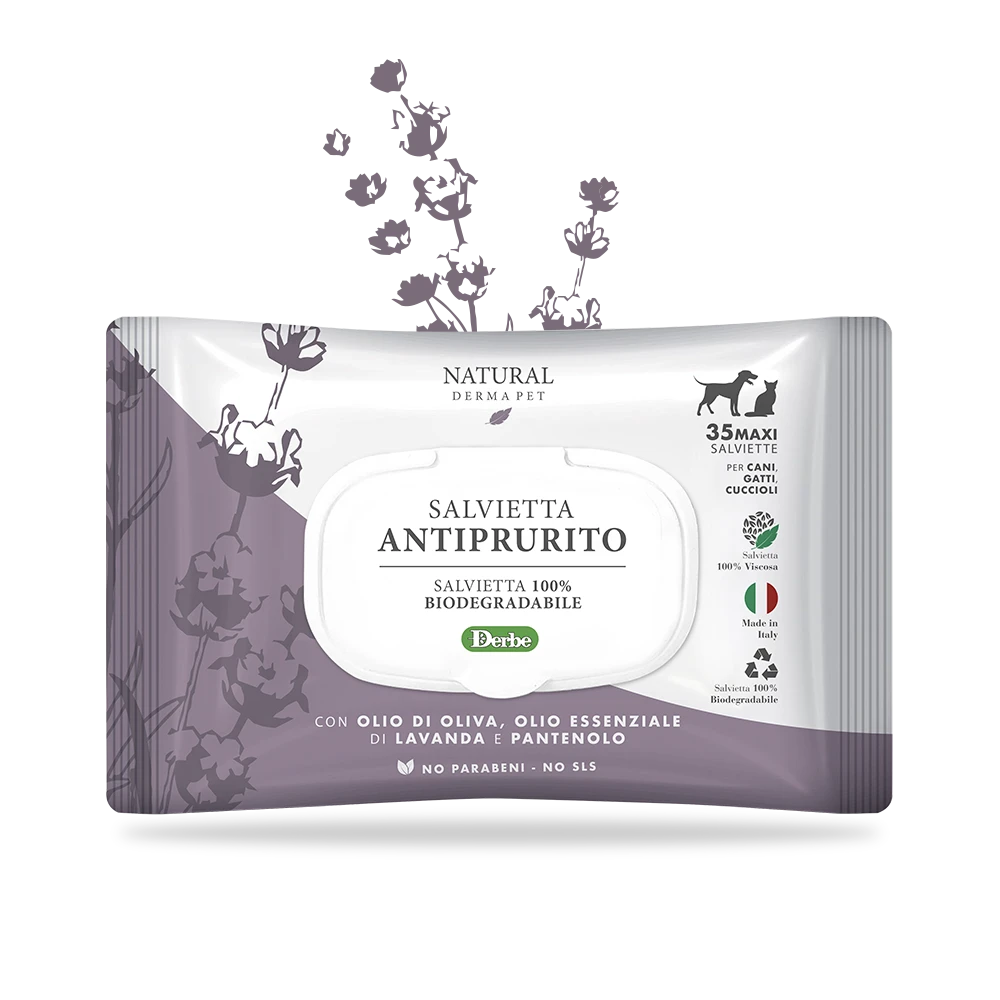 Le salviette antiprurito detergono, calmano e danno sollievo al prurito, sfruttando l’azione emolliente e detergente dei preziosi componenti da cui sono costituite. Utili in tutte le condizioni in cui è opportuna una detersione senza acqua che contemporaneamente protegge il manto e la cute sensibilizzati da agenti esterni. Ottime per detersione in viaggio, nel bosco, al mare. L’olio essenziale di lavanda possiede delle ben note proprietà calmanti, rigeneranti e antiprurito. L’olio di oliva abbinato al pantenolo (pro vitamina B5) svolge un ruolo protettivo e straordinariamente emolliente.