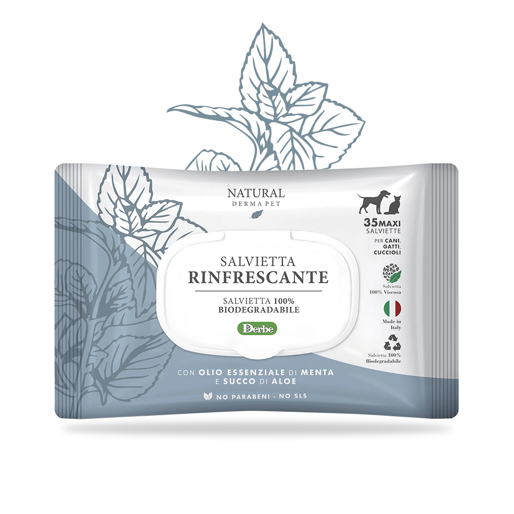 Salviette rinfrescanti per cani e gatti ideali per una detersione fresca e deodorante. Arricchite con olio essenziale di Menta, stimolano la circolazione cutanea, favorendo un manto sano e forte, e aiutano ad attenuare il prurito. Il succo di Aloe Vera svolge un’azione lenitiva e calmante, donando freschezza immediata e comfort alla cute. Perfette in viaggio, all’aria aperta o a casa, per un’igiene quotidiana rinfrescante ed efficace.