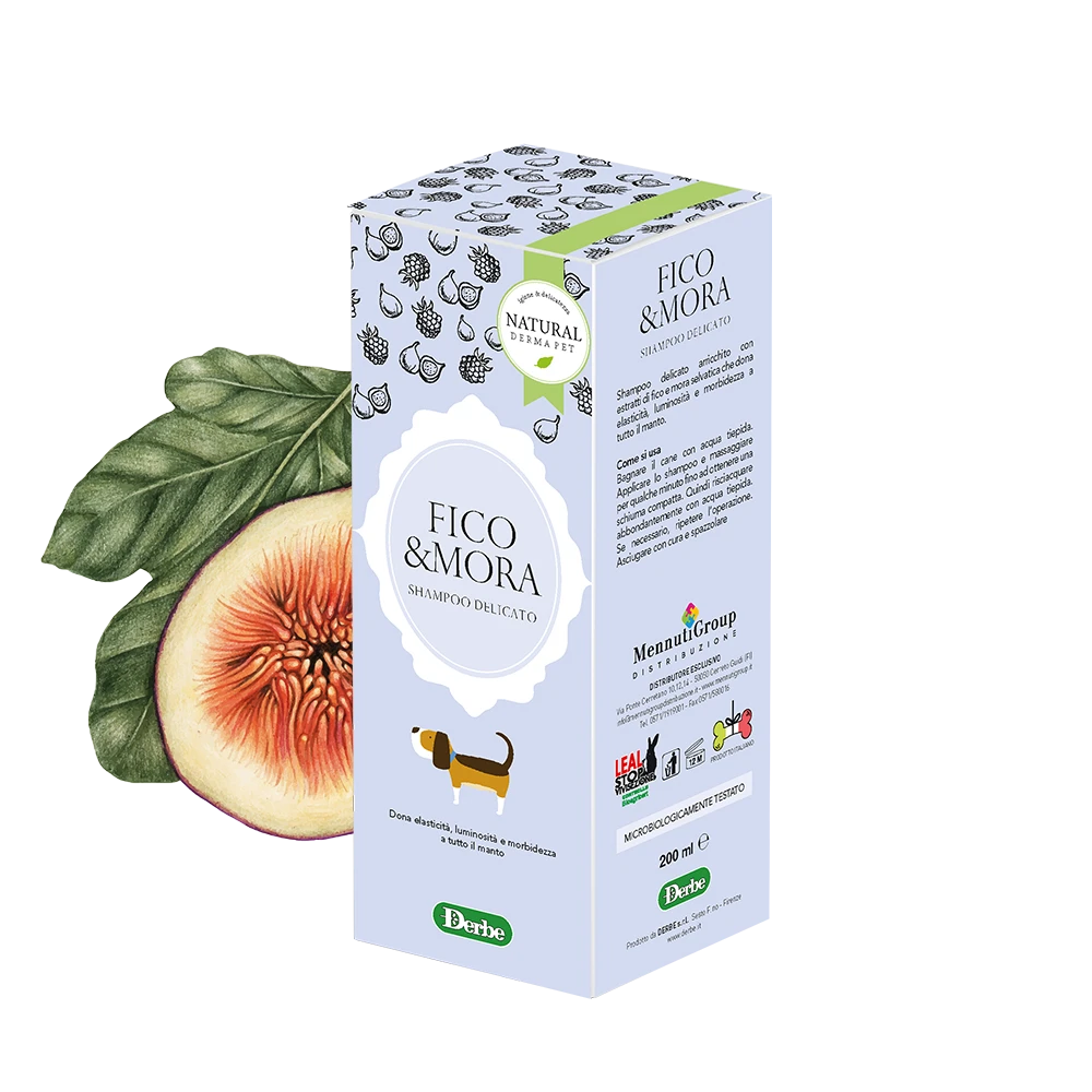 Shampoo fico e mora selvatica shampoo delicato arricchito con estratti di fico e mora selvatica che dona elasticità, luminosità e morbidezza a tutto il manto.